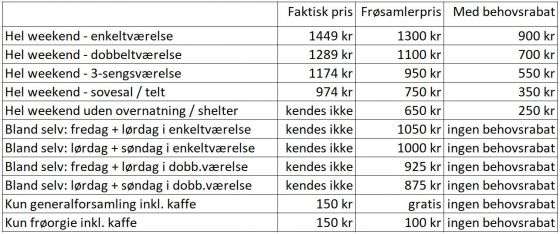 Som altid yder foreningen et tilskud på alle tilmeldinger, så du betaler kun 75-85 % af den faktiske pris. Se skemaet herunder ("Faktisk pris" og "Frøsamler pris"). Det er i øvrigt altid gratis at deltage i generalforsamlingen, men tilmelding er nødvendigt af hensyn til kursusstedet.